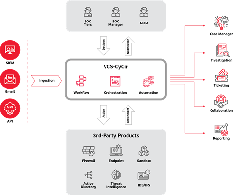 Giải pháp VCS-CyCir có khả năng xác định, ưu tiên và tiêu chuẩn hóa các chức năng ứng phó sự cố, giải quyết toàn bộ các thách thức trên. Được xây dựng dựa trên công nghệ tự động hóa thông qua việc tích hợp với các công nghệ bảo mật thông tin, theo các kịch bản xử lý được định nghĩa tự động, VCS-CyCir giúp tổ chức đạt được mục tiêu tối ưu hóa hiệu quả trong quá trình quản lý và vận hành các hệ thống ATTT.